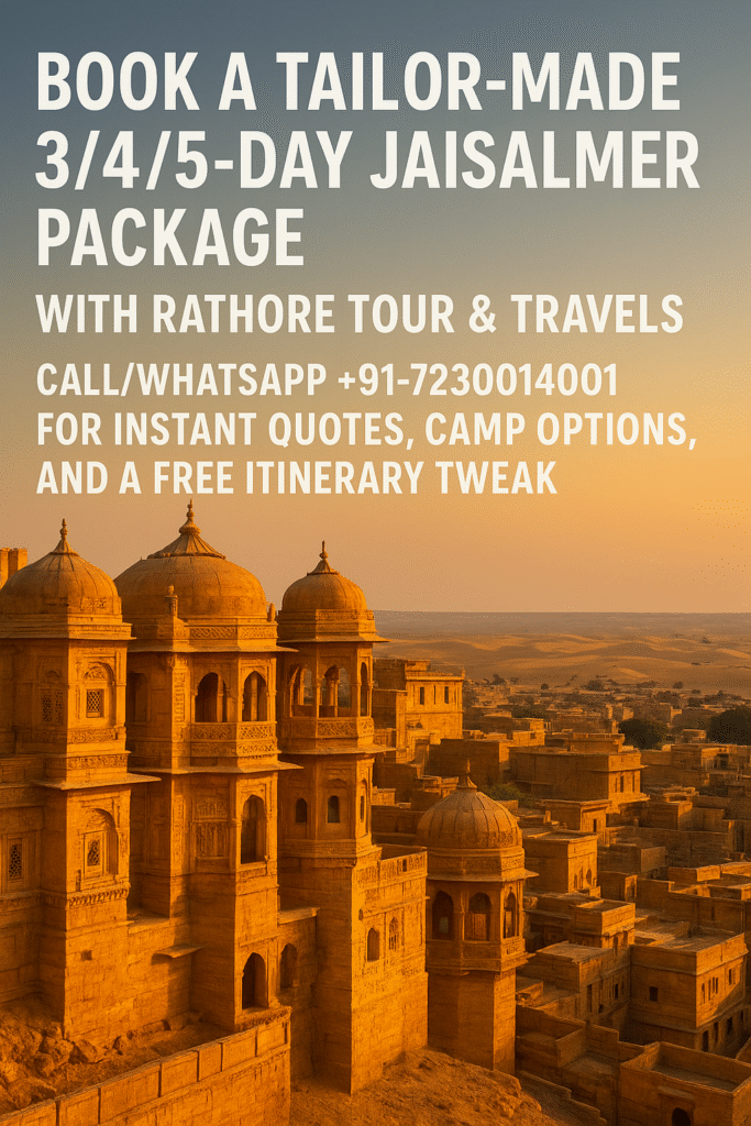 Book a tailor-made 3/4/5-day Jaisalmer package with Rathore Tour & Travels — call/WhatsApp [insert contact: +91-7230014001 for instant quotes, camp options, and a free itinerary tweak.